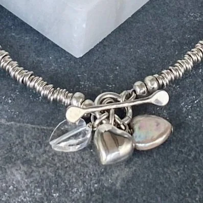 Tiny silver rings strung on silver Soft Flex make up this classic chain. A triple charm of a rock crystal heart, a silver puff heart, and a cream freshwater pearl heart hanging from a front closing silver T-bar make this a special piece, and one of our most popular items for weddings.